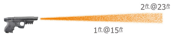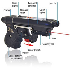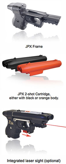 Why the JPX is the better choice The JPX represents a significant departure from conventional irritant pressurized canister designs. Modeled after a pistol, it fires farther with more precision than ordinary pepper spray. The pattern is subject-specific with 14 inches spread at 16.5 feet. The JPX does not rely on electronics or battery power & is virtually impervious to environmental conditions. Each magazine carries two self-cleaning cartridges, making multiple shots possible. Reloading is fast & easy. An integral laser sight is optional.